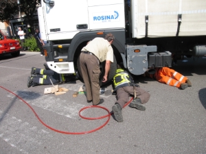 ein Fahrradfahrer wurde von einem LKW überfahren und blieb mit lebensgefährlichen Verletzungen unter diesem eingeklemmt liegen. Der Radfahrer wurde mittels hydraulischen Rettungsgerät von den Feuerwehrmännern befreit und vom Weissen und Roten Kreuz betreut.