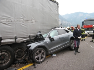 Ein Pkw des Typ Audi Q7 fuhr aus noch ungeklärten Umständen ungebremst auf einen in der Ausweichstelle stehenen Sattelschlepper auf. Der Pkw bohrte sich fast völlständig unter den Anhänger des LKW's. Der ersten Rettungsmannschaft des Weissen Kreuz Neumarkt bot sich ein schreckliches Bild der Verwüstung. Im völlig zerstörten Fahrzeug konnte eine weibliche Person auf der Fahrerseite und eine männliche Person auf der Beifahrerseite erkannt werden. Kurz darauf wurde auch eine weitere Person im Wrack entdeckt, diese war zwischen Beifahrersitz und Rückbank des Fahrzeuges komplett eingeklemmt. Der Notarzt des Rettungshubschraubers des "Trentino Emergenza" konnte nur mehr den Tod der beiden Erwaschsenen und des 11- jährigen Mädchen feststellen. Alle drei Insassen wurden mit großer Gewissheit durch die enorme Wucht des Aufpralles auf der Stelle getötet.