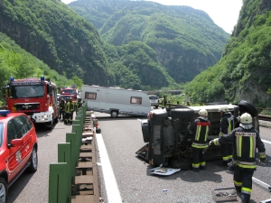 Zur Mittagszeit wurde die Mannschaft der Berufsfeuerwehr Bozen zu einem Verkehrsunfall auf die Brennerautobahn gerufen. Auf der Südspur bei Kilometer 65, zwischen Klausen und Bozen Nord, war ein Pkw mit Wohnanhänger verunfall. Dabei kippte das Fahrzeug um und der Anhänger stellte sich auf der Fahrbahn quer, wobei dieser auf den Mittelleitplanken aufsaß. Die Insassen wurden vom bereits eingetroffenen Rettungsdienst versorgt und ins Krankenhaus gebracht. Gemeinsam mit der Freiwilligen Feuerwehr Klausen wurden das Fahrzeug aufgestellt und der Wohnanhänger von den Leitplanken gehoben. Während des Einsatzes blieb eine Fahrbahn der Nordspur, sowie kurzzeitig die gesamte Südtspur für der Verkehr geschlossen. Am Einsatzort waren auch die Straßenpolizei und der Straßendienst der A22.