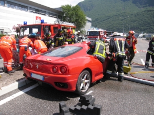 Heute. Sonntag, 29.Juli 2012 ist die Berufsfeuerwehr Bozen von der Landesnotrufzentrale zu einem schweren Verkehrsunfall in die Einsteinstrasse in Bozen alarmiert worden. Zwei Personen fuhren in einem Ferrari 360 Modena die Einsteinstrasse entlang als sie die Herrschaft über das Fahrzeug verloren haben und gegen einen Masten der Strassenbeleuchtung prallten, anschliessend wurde das Fahrzeug samt Laternenmast ca. 30m auf die Gegenfahrbahn katapultiert. Durch den heftigen Aufprall wurden sowohl Fahrer als auch Beifahrer verletzt. Während der Fahrer neben dem Fahrzeug lag war der minderjährige Beifahrer beim Eintreffen der Feuerwehr noch im Fahrzeug eingeklemmt. Er wurde in zusammenarbeit mit dem Rettungsdienst aus dem Ferrari befreit und mit lebensgefährlichen Verletzungen ins Krankenhaus gebracht. Das Fahrzeug wurde vollständig zerstört.