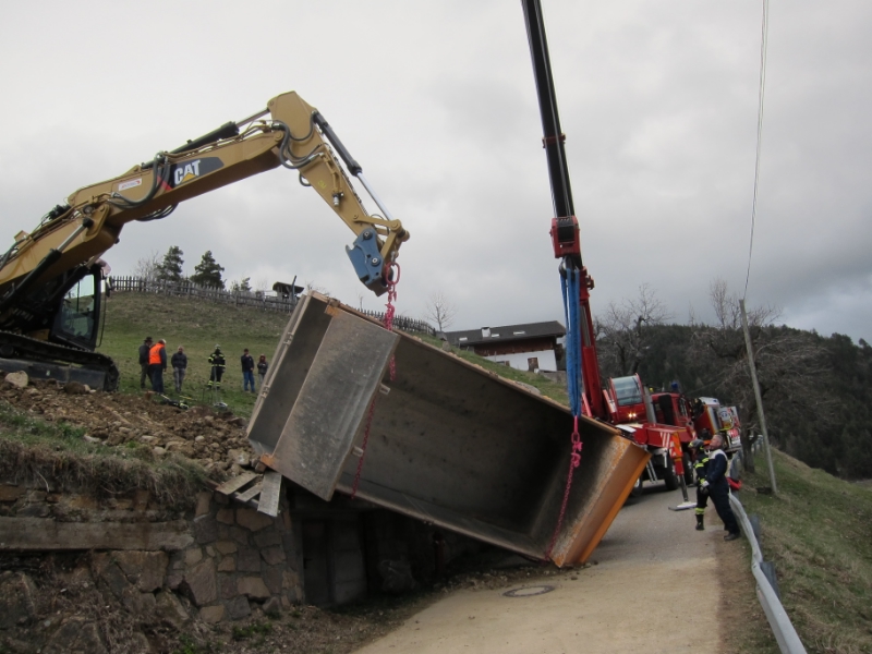 Das Schwerfahrzeug war beim Entladevorgang von Erde auf einem abschüssigen Feldweg umgekippt und auf die darunterliegende Straße, welche zum Gamperhof führt, gefallen.