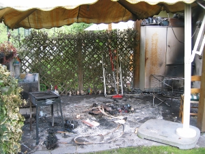 Fettbrände (brennender Grill) mit einer Löschdecke ersticken oder mit einem Pulverfeuerlöscher bekämpfen.