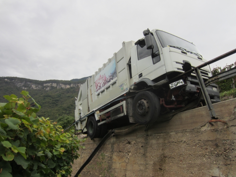 Gegen 14:00 Uhr geriet das Fahrzeug im Ortsteil St.Jackob bei Tramin, aus noch ungeklärten Umständen, gegen die Leiplanken der Hauptstraße, durchbrach diese zum Teil und kam schließlich zum Stehen. Der Fahrer konnte das Fahrzeug unverletzt verlassen, der LkW droht jedoch über die rund 3m hohe Stützmauer, auf den darunterliegenden Weinacker, zu stürzen. Nachdem die Feuerwehr Tramin das Fahrzeug mittels Hubzug gesichert hatte, wurde die Berufsfeuerwehr Bozen mit der Kranmannschaft zum Einsatzort gerufen. Die Bergung des Müllfahrzeuges gestaltet sich schwierig, da die Fahrbahn sehr schmal war und zudem eine Stromleitung den Bereich überquerte. Nach rund 3 Stunden Bergungsarbeit konnte das Fahrzeug wieder auf die Fahrbahn gehoben werden. Im Einsatz standen neben dieser Berufsfeuerwehr, die Freiwillige Feuerwehr Tramin und die Gemeindepolizei.