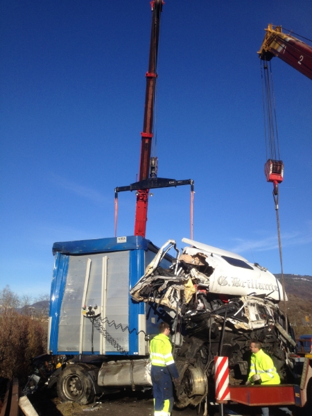 Kurz nach 12:30 Uhr kommt es auf der A22 südlich von Neumarkt zu einem schweren Unfall. Ein Sattelzug streifte einen auf der Not-Spur stehenden 2.Sattelzug und stellt sich auf der Süd-Spur quer. Am Unfall war auch ein Pkw beteiligt. Trotz der starken Zerstörung der beiden Fahrzeuge und insbesondere der Fahrerkabine wurde keiner der beteiligten ernsthaft verletzt. Die Bergung der Unfallfahrzeuge gestaltete sich aufwendig, so mussten vor der Bergung Leitplanken abgetrennt und Treibstoff aufgefangen, bzw. abgepumpt werden. Zur Bergung des quer zur Fahrbahn verkeilten Sattelzuges mussten zwei Kräne positioniert werden. Erst nach Anheben des Aufliegers mittels Kran der Berufsfeuerwehr Bozen und Anziehen mittels eines Kranes eines Abschleppunternehmens, konnte das Fahrzeug geborgen werden. Durch den Unfall und den darauffolgenden Bergungsarbeiten blieb die Süd-Spur der Autobahn für längere Zeit für den Verkehr gesperrt.