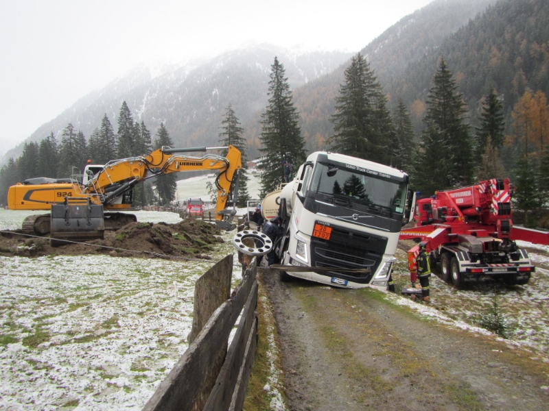BF-BZ-VVF-BZAm 06.11.2014 um 10:40 wurde die Berufsfeuerwehr Bozen zu einem Kraneinsatz in Innerpens (Sarntal) gerufen. Ein Tankwagen, befüllt mit 15.000 l Heizöl einer Firma aus dem Trentino war auf einer Seitenstrasse eingebrochen und drohte ins Talferbach abzustürzen. Vorab wurde das Heizöl auf einem anderen Tankwagen derselben Firma umgefüllt und mit Hilfe des Krans der Berufsfeuerwehr und der Bagger der Firma Kral Tiefbau konnte das Fahrzeug angehoben und der Untergrund befestigt werden. Anschliessend konnte das Fahrzeug aus der misslichen Lage mittels Seilwinde gezogen werden. Der Tanklaster konnte seine Fahrt danach fortsetzen. Im Einsatz stand die Freiwillige Feuerwehr Pens und die Berufsfeuerwehr Bozen.