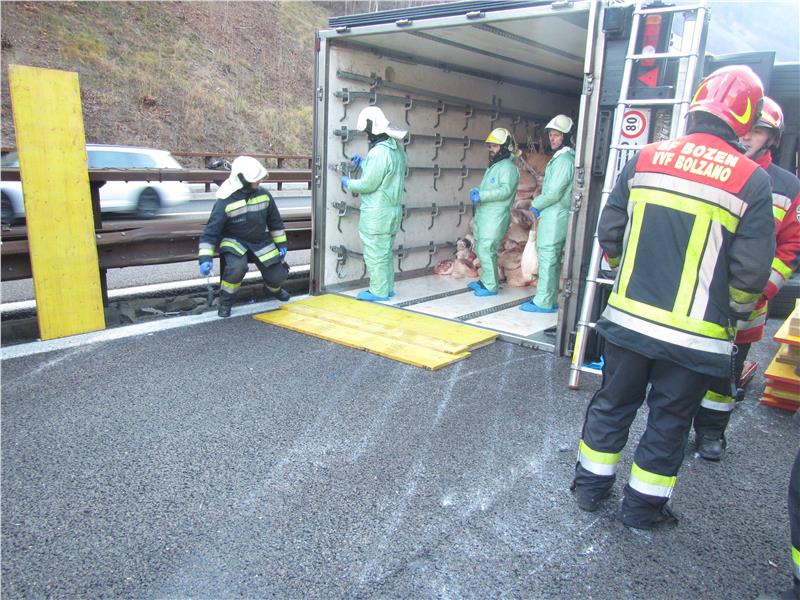 Gegen 07:00 Uhr in der Früh am Heiligen Abend führte ein zu gewagtes Fahrmanöver einer italienischen Speditionsfirma beim Einfahren in die Autobahn zum Umkippen des Fahrzeuges. Der Fahrer verletzte sich dabei nur leicht. Die Zugmaschine samt Anhänger kam auf der Überholspur seitlich zum Liegen und blockierte diese. Für die Aufrichtung des Fahrzeuges wurde diese Berufsfeuerwehr zusammen mit der Freiwilligen Feuerwehr von Klausen alarmiert. Die vollbeladene Ware in Form von Schweinskeulen mußte jedoch zunächst auf einen zweiten herbeigerufenen Kühlwagen umgeladen werden. Die arbeits- und zeitintensiven Arbeiten dauerten bis ca. 15:00 Uhr. Anschließend wurde der Kühltransporter mit dem Kranwagen dieser Bereufsfeuerwehr aufgerichtet und dem Abschleppunternehmen übergeben. Für die Dauer der Arbeiten blieb die Südspur der Autobahn nur auf der Normalspur geöffnet. Zeitweilig wurde auch ein Gegenverkehrsbereich auf der Nordspur eingerichtet. Zu ausgedehnten Staus kam es jedoch nicht, da sich das Verkehrsaufkommen am Heiligen Abend in Grenzen hielt. Im Einsatz standen neben der Berufsfeuerwehr Bozen und der Freiwilligen Feuerwehr von Klausen auch die Straßenmeisterei und Straßenpolizei der Autobahn A22, sowie ein Amtstierarzt der Sanitätseinheit von Brixen, welcher die Umladeaktion überwachte