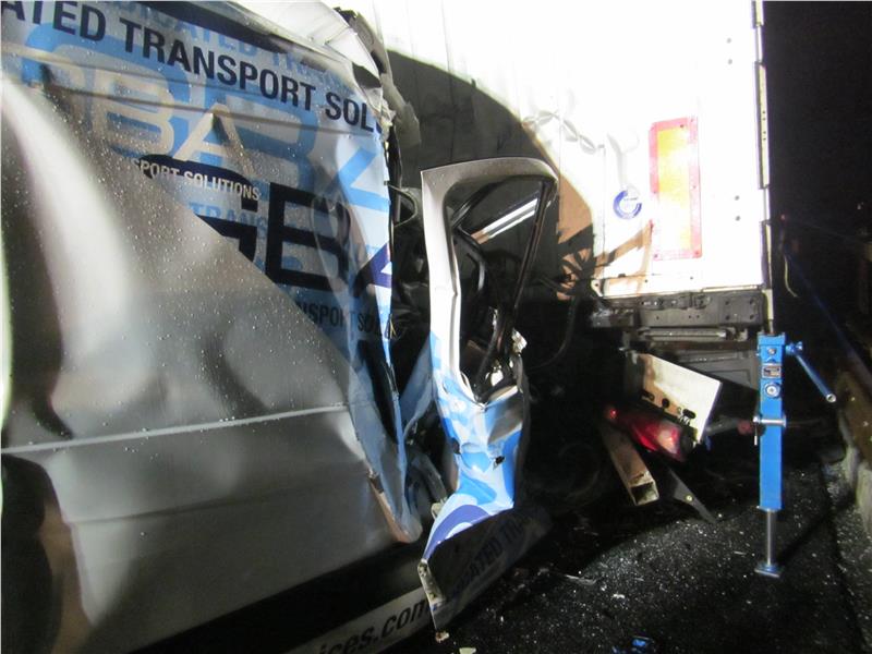 Ein Lieferwagen fährt mit voller Geschwindigkeit auf einen stehenden Sattelschlepper auf.