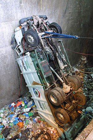 Foto: BF BozenAufsehen erregender Unfall auf dem Gelände des Müllverbrennungsofens: Ein Müllwagen aus Leifers stürzt rund zwölf Meter tief in die Abfallgrube der Müllverbrennungsanlage Bozen. Der Lenker zog sich dabei erhebliche Verletzungen zu. Die Fahrerkabine hatte sich an die zur Rampe entgegengesetzte Wand gedrückt. Um den eingeklemmten Lenker zu bergen, mussten sich die Wehrmänner abseilen. Der Notarzt kletterte für die Erstversorgung über die Drehleiter zu den Mann hinunter. Die Wehrmänner montierten vom Müllkran den Greifer ab und befestigten die Trage am Kran. Gegen 8.30 Uhr gut nach 1,5 Stunden wurde der verletzte Fahrer von den Rettern in das Krankenhaus gebracht.