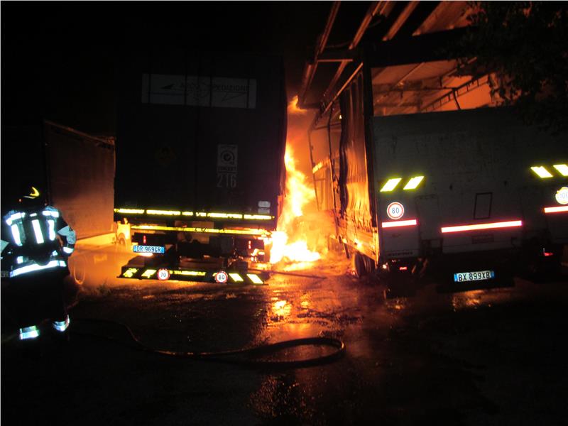 Um 3.20 wurde die Berufsfeuerwehr Bozen zu einem Brand in der Achille Grandi Straße in Bozen gerufen. Auf dem Parkplatz eines Frächters brannten drei Lastkraftwagen.