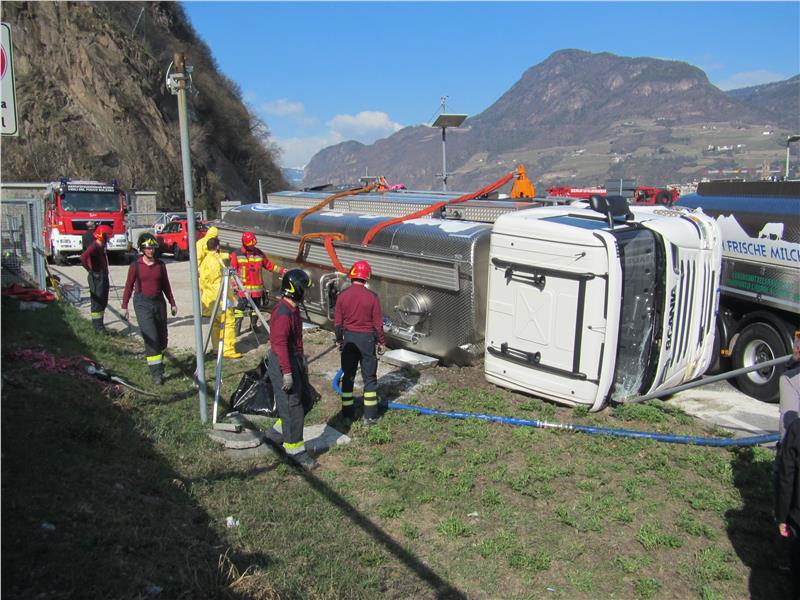 Gegen 10:00 Uhr des 27.03.2018 wurde diese Berufsfeuerwehr auf die Virgelbrücke von Bozen gerufen, nachdem sich ein vollbeladener Milchtransporter der Firma Mila aus nicht geklärten Umständen überschlagen hatte. Der Fahrer selbst verletzte sich nicht. Für die Bergungsarbeiten mussten die 20 t Milch jedoch zunächst unter Aufsicht des landestierärztlichen Dienstes und unter Einhaltung der Hygienebestimmungen umgeladen werden. Mithilfe des Autokranes der Berufsfeuerwehr wurde das Fahrzeug schließlich wieder auf die Räder gestellt. Für die Dauer der Arbeiten bis ca. 12:30 Uhr, blieb die Einfahrtsrampe von der Virgelbrücke Richtung Innsbrucker Straße gesperrt. Im Einsatz standen neben dieser Berufsfeuerwehr die Stadtpolizei, Rettungsdienst, Landestierärztlicher Dienst, Finanzpolizei und ein privates Abschleppunternehmen.