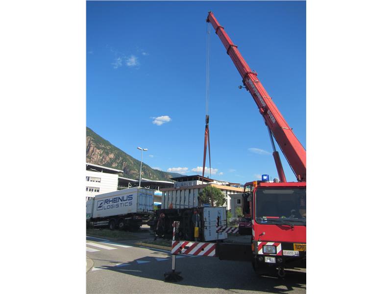 Am heutigen Dienstag, 19.06.2018 gegen 16.50 Uhr wurde diese Berufsfeuerwehr zu einem Verkehrsunfall in die T. Edisonstrasse in Bozen gerufen. Ein mit Gefahrgut beladener LKW - Anhänger war umgekippt, es gab keine Verletzte.
