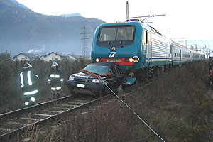 Foto BF BozenMehrere glückliche Umstände verhinderten gestern Früh in Terlan eine Katastrophe. Ein geistig verwirrter hatte einen Geländewagen auf dem Bahngleis geparkt und sich dann entfernt. Ein Zug, in dem sich nur die Lokführer befanden, prallte darauf, entgleiste zum Glück aber nicht. Die zwei Lokführer blieben unverletzt.