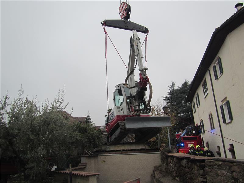 In der Unteralberstraße ist ein auf einem Traktoranhänger beladener 4 t Hydraulikbagger durch das Berühren eines Telefonkabels seitlichabgerutscht und in einer Schieflage geraten. Beim Unfall gab es keine Verletzte. Die Freiwillige Feuerwehr St. Michael Eppan sperrte die Einsatzstelle ab und führte mit dem schweren Rüstfahrzeug Sicherungsmaßnahmen am Bagger durch. Mit dem schweren Kranfahrzeug der Berufsfeuerwehr wurde der Hydraulikbagger wieder aufgerichtet und auf den Anhänger gestellt. Aufgrund der Einsatzlage und engen Platzverhältnisse dauerte der Einsatz ca. 2 Stunden. Neben der Freiwilligen Feuerwehr St. Michael Eppan und der Berufsfeuewehr war auch die Ortspolizei im Einsatz. Die Gemeindestraße war während den Bergungsarbeiten gesperrt.