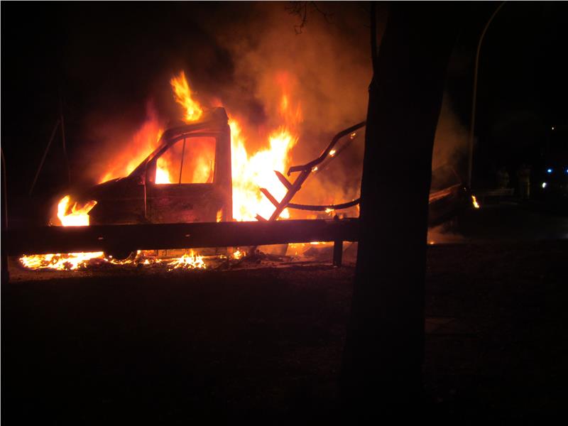 Der Kleinlaster der auf der Ausfahrt der Raststätte abgestellt war, war komplet in Vollbrand . Die Mannschaft hat den Brand in kürzester Zeit unter Kontrolle gebracht.