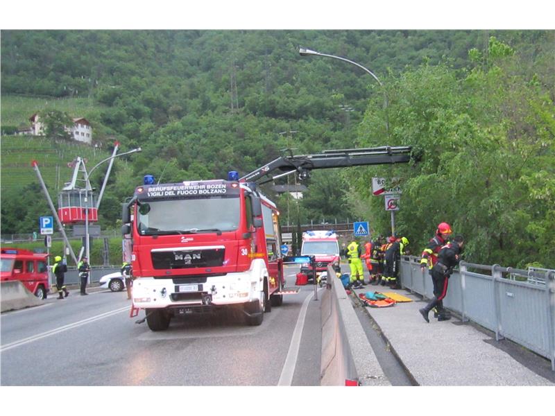 Nachdem ein unklarer Anruf, bei der Notrufzentrale 112 eingegangen war, wurde dieser an die Einsatzzentrale der Berufsfeuerwehr weitergeleitet. Gemeinsam wurde versucht den Anruf zu entziffern, was aber auf Grund fehlender Kommunikation des Anrufers äußerst schwierig war. Lediglich durch die Lokalisierung des eingegangenen Notrufs und der dazu passenden Hintergrundgeräusche von fließendem Wasser wurde entschieden eine Mannschaft zur Abklärung an die Kampiller Brücke bei Bozen zu schicken. Dort konnte nach kurzer Suche eine abgestürzte Person in ungefähr 5 Meter Tiefe, am Rande des Flusses, entdeckt werden. Die Person wurde von den Rettungssanitätern der Berufsfeuerwehr erstversorgt und dann mittels Seilwinde auf die Brücke gehoben. Dort wurde der Verletzte vom Notarzt behandelt und ins Krankenhaus gebracht. Im Einsatz standen auch das Weiße und Rote Kreuz, die Stadpolizei und die Carabinieri.