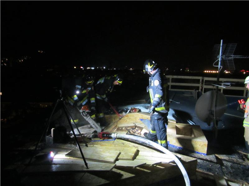 Am Freitag, den 18.10.2019 ist gegen 20:40 Uhr diese Berufsfeuerwehr wegen eines Dachstuhlbrandes in die Bozner Roenstraße Nr. 57 alarmiert worden. Auf dem Dach des 8-stöckigen Kondominiums, an dem zur Zeit Renovierungsarbeiten durchgeführt werden, hatte die Isolierung Feuer gefangen. Die Flammen wurden in kurzer Zeit gelöscht. Um die Glutnester aber vollständig ab zu löschen mussten mit Spezialsägen ca. 25 m² vom Dach aufgeschnitten werden.
