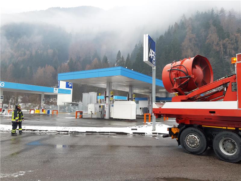 Bei der Gastankstelle auf dem Sadobre Gelände in der Gemeinde Freienfeld entlang der Autobahn A22 ist es aus noch ungeklärten Gründen heute Montag, den 16.12.2019 zu einem massiven Flüssigmethangasaustritt (LNG) um ca. 11.15 Uhr gekommen.