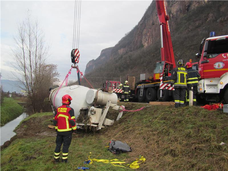 Heute Vormittag kurz nach 08:00 Uhr wurde die Kranmannschaft der Berufsfeuerwehr Bozen zur Unterstützung der FF Branzoll zu einem Verkehrsunfall gerufen. Auf der Staatsstraße, auf der Höhe der Firma Südtirolfer, war es zu einem Unfall gekommen. Dabei kam ein mit Beton beladenes Schwerfahrzeug von der Straße ab und landete seitlich in einem Wasserkanal. Der Fahrer konnte das Fahrzeug selbsständig verlassen, er wurde nur leicht verletzt. Die Bergung des Schwerfahrzeuges gestaltete sich auf Grund des hohen Gewichtes schwer. Das Fahrzeug und die Betontrommel mussten separat aus dem Graben geborgen werden. Für die Dauer des Einsatzes, welcher über 3 Stunden dauerte, wurde die Straße komplett für den Verkehr gesperrt. Im Einsatz standen auch die Carabinieri, die Lokalpolizei und der Straßendienst.