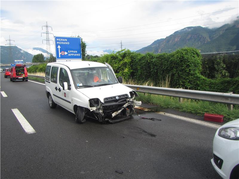 Ein Personenkraftwagen der Bezirksgemeinschaft Burggrafenamt kam auf der Höhe der Q8 Tankstelle - bei km 223 der Nordspur - ins Schleudern und beendete ihre Fahrt auf der Mitteilleitplanke.