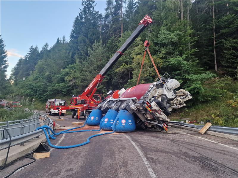 Gegen 17:45 Uhr wurde die Kranmannschaft der Berufsfeuerwehr Bozen zur Unterstützung der Freiwilligen Feuerwehr Lengmoos/Klobenstein gerufen. Auf der Landesstraße LS73 bei Kilometer 17 in der Fraktion Lengmoos ist eine Fahrmischerbetonpumpe in einer Linkskurve zur Seite gekippt. Der Fahrer wurde glücklicherweise nicht eingeklemmt und wurde nach einer Erstversorgung durch die Sanitäter des Weißen Kreuzes in Bozner Spital eingeliefert.