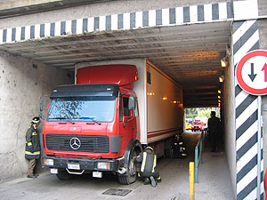 Foto BF BozenAm Donnerstag, den 1. April 2004 wurde die Berufsfeuerwehr Bozen gegen 09.15 Uhr mit der Kranmannschaft zur Bahnunterführung im Bozner Bodenweg gerufen. Dort hatte sich ein LKW unter der Bahnunterführung verkeilt, da der Fahrer die Höhenbeschränkung mißachtet hatte. Um eine schonende Bergung des LKW's zu ermöglichen, wurde die Luft aus den Reifen abgelassen und anschließend der LKW mittels einer Seilwinde des Rüstwagens aus der Unterführung befreit. Die Strasse war während der Bergungsarbeiten für ca. eineinhalb Stunden für den Verkehr gesperrt. Der LKW konnte nach der neuerlichen Befüllung der Reifen wieder selbst die Fahrt bis zur nächsten Werkstatt fortsetzen