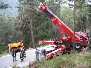 Foto BF BozenEin LKW Typ IVECO rutschte um ca. 16.00 Uhr von der Fahrbahn ab und kippte ca. 20m über die Böschung. Der Fahrer erlitt leichte Verletzungen und wurde in das Bozner Krankenhaus gebracht. Die FF Mölten welche vor Ort als erste ankam, forderte als Unterstützung den Kranwagen der Berufsfeuerwehr an. Mit Hilfe des Kranwagen wurde der LKW auf die Straße gehoben. Der Einsatz dauerte ca. 4 Stunden, wobei insgesamt 15 Mann zum Einsatz kamen.