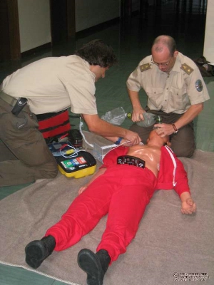 Deshalb wurde das gesamte Einsatzpersonal der Berufsfeuerwehr Bozen, zu den bereits vorhandenen Kentnissen der Wiederbelebung und Erste Hilfe, zusätzlich zu AED - Anwender ausgebildet. Die verantwortlichen Notärzte und Krankenpfleger der Landesnotrufzentrale, denen an dieser Stelle herzlich gedankt sei, haben mit großer Professionalität alle Berufsfeuerwehrmänner/frauen ausgebildet und anschließend mittels einer theoretischen und praktischen Prüfung für die Anwendung der AED zertifiziert. Einmal pro Jahr werden alle Feuerwehrmänner/frauen an diesem Gerät nachgeschult.
