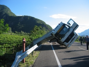 Auf Brenner - Staatstrasse bei Branzoll rutscht ein mit Betonplatten beladener LKW mit Spezialanhänger in den Strassengraben. Aufwendige Bergearbeiten mit Feuerwehrkran