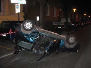 Foto BFBZ - VVFBZNach einem Zusammenstoß zweier Fahrzeuge an der Kreuzung Venediger Straße - Fiume Straße überschlägt sich ein Fahrzeug. Die Lenkerin, eine junge Frau aus Bozen wird dabei nur leicht verletzt und von einer Ambulanz ins Krankenhaus gebracht. Zum Zusammenstoß kam es, nachdem ein Fahrzeug gegen den Einbahnverkehr auf die Kreuzung einfuhr. Die Straße mußte auf Grund des ausgelaufenen Öl's von der Berufsfeuerwehr gereinigt werden.