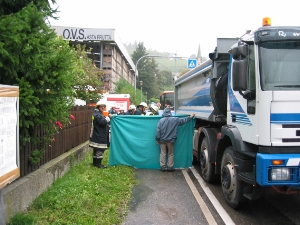 FOTO BFBZ - VVFBZAm Nachmittag des 11.10.2004 wurde die Berufsfeuerwehr Bozen zu einem schweren Verkehrsunfall in Frangart gerufen. Dabei wurde eine junge Frau von einem LKW überrollt und blieb unter der Hinterachse des LKW’s eingeklemmt. Während der herbeigerufene Notarzt des Weissen Kreuzes nur noch den bereits eingetretenen Tod feststellen konnte, musste die Berufsfeuerwehr Bozen zusammen mit der Freiwilligen Feuerwehr Frangart den LKW mittels pneumatischen Hebekissen anheben um die Frau zu bergen. Im Einsatz standen auch die Carabinieri aus Eppan.