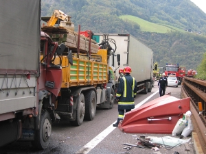 Foto BFBZ - VVFVZAm heutigen Vormittag (9:24 Uhr) wurde die Berufsfeuerwehr zu einem LKW-Unfall auf der Südspur der A22 gerufen. Im Bereich zwischen Klausen und Bozen Nord war es zu einem Auffahrunfall zwischen drei LKW's gekommen. Im dritten Fahrzeug wurde der Fahrer eingeklemmt und schwer verletzt, er musste mit hydraulischem Gerät befreit werden. Der schwerverletzte Fahrer wurde nach der Erstversorgung mit dem Rettungshubschrauber ins Krankenhaus geflogen. Die Anfahrt zur Unfallstelle wurde durch den kilometerlangen Stau erschwert. Vor Ort waren auch die FF.Klausen, Straßenpolizei, Rettungsdienst und der Straßendienst. Für die Zeit der Rettungs- und Bergungsarbeiten wurde die Südspur komplett für den Verkehr gesperrt.