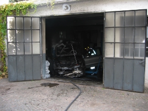 Foto BFBZ - VVFBZHeute um 10:00 Uhr musste die Berufsfeuerwehr Bozen zu einem Brand in der Schmiedgasse ausrücken. In einer mechanischen Werkstätte hatte ein Fahrzeug des Typs Fiat Bravo wegen eines technischen Defektes Feuer gefangen. Während das Fahrzeug völlig ausbrannte, konnten durch den raschen Einsatz größere Schäden an der Werkstatt verhindert werden.