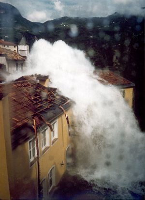 18 agosto 1997 - ore 10.20: esplode, con un getto d’acqua alto 20 metri e un metro e mezzo di diametro, un tombino di un pozzo d’ispezione della condotta forzata “ex Rössler”, che passa per il cortile del civico n. 3 di via Cavour. Più di 400 mila litri di acqua, che distruggeranno completamente con la loro forza due abitazioni, inonderanno con oltre mezzo metro di acqua strade, negozi, cantine e garage, causando danni per più di quattro miliardi di lire. Il lavoro di prosciugamento e di riassestamento impegnerà i vigili del fuoco di Bolzano e i vigili volontari per giorni, in particolare il lavoro di deumidificazione per salvare i preziosi affreschi della chiesetta di S. Giovanni in Villa, invasa da quasi un metro e mezzo d’acqua. La causa probabile di questo disastro è da attribuire ad una saracinesca abbassata troppo velocemente nel corso di lavori ad una centralina elettrica, creando il cosiddetto “colpo d’ariete”.