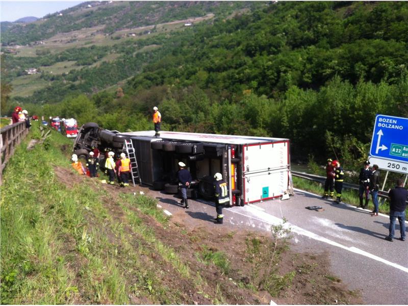 Venerdí 22 aprile intorno alle 9 ca. la Centrale Operativa Provinciale é stata allarmata per due incidenti stradali di camion, avvenuti a pochi minuti l'uno dall'altro. Il Corpo Permamente dei vigili del fuoco di Bolzano é intervenuto con due gru, come previsto dal piano di allertamento. Un mezzo pesante si é ribaltato a Nord di Cardano sulla Strada Statale del Brennero, bloccandola completamente. Il conducente é stato estratto dalla cabina con ferite mediogravi e consegnato al servizio sanitario. Con lui vi era un passeggero anch'esso trasportato all'ospedale. Il carico di carne trasportato viene attualmente scaricato, dopo aver avuto relativa autorizzazione del medico veterinario competente, in modo da poter rimettere il mezzo sulle ruote utilizzando la gru. La Strada statale rimarrà chiusa ancora per qualche ora.