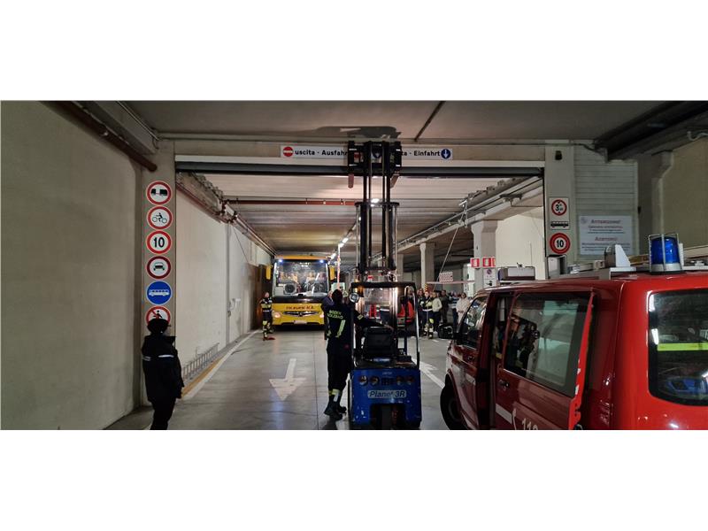 Il Corpo permanente dei Vigili del Fuoco di Bolzano, giunto sul posto dopo l’allarme, ha constatato che il portone non poteva essere né aperto né chiuso. In collaborazione con i Vigili del Fuoco volontari di Bolzano, la cui sede si trova nello stesso edificio, è stato utilizzato un muletto per sollevare il portone in modo controllato e fissarlo in posizione stabile tramite cinghie a cricchetto.